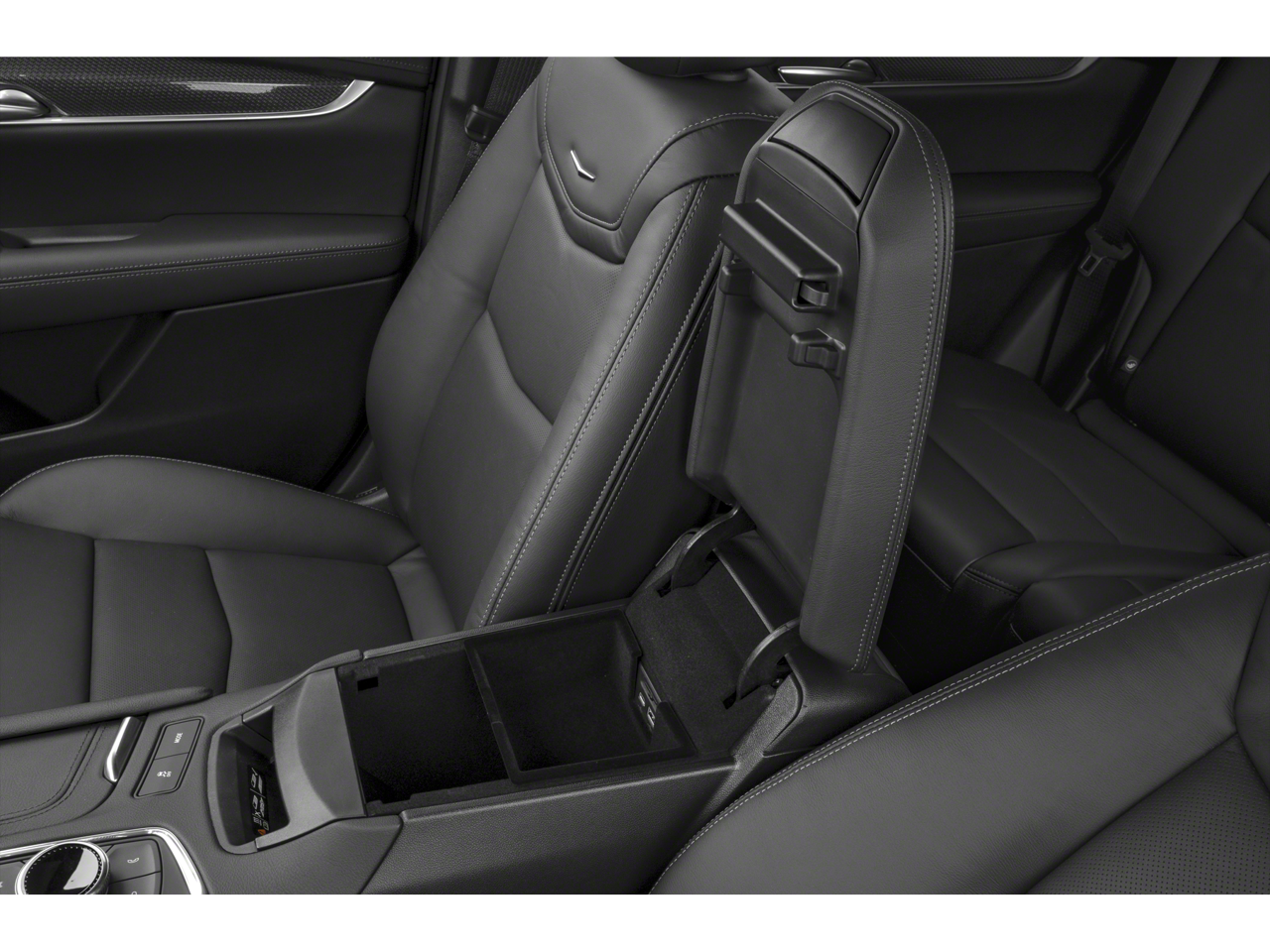- Opens or closes when the system senses the key fob and the driver extends their foot under the left-hand side of the rear bumper over an image of the Cadillac Crest projected under the vehicle